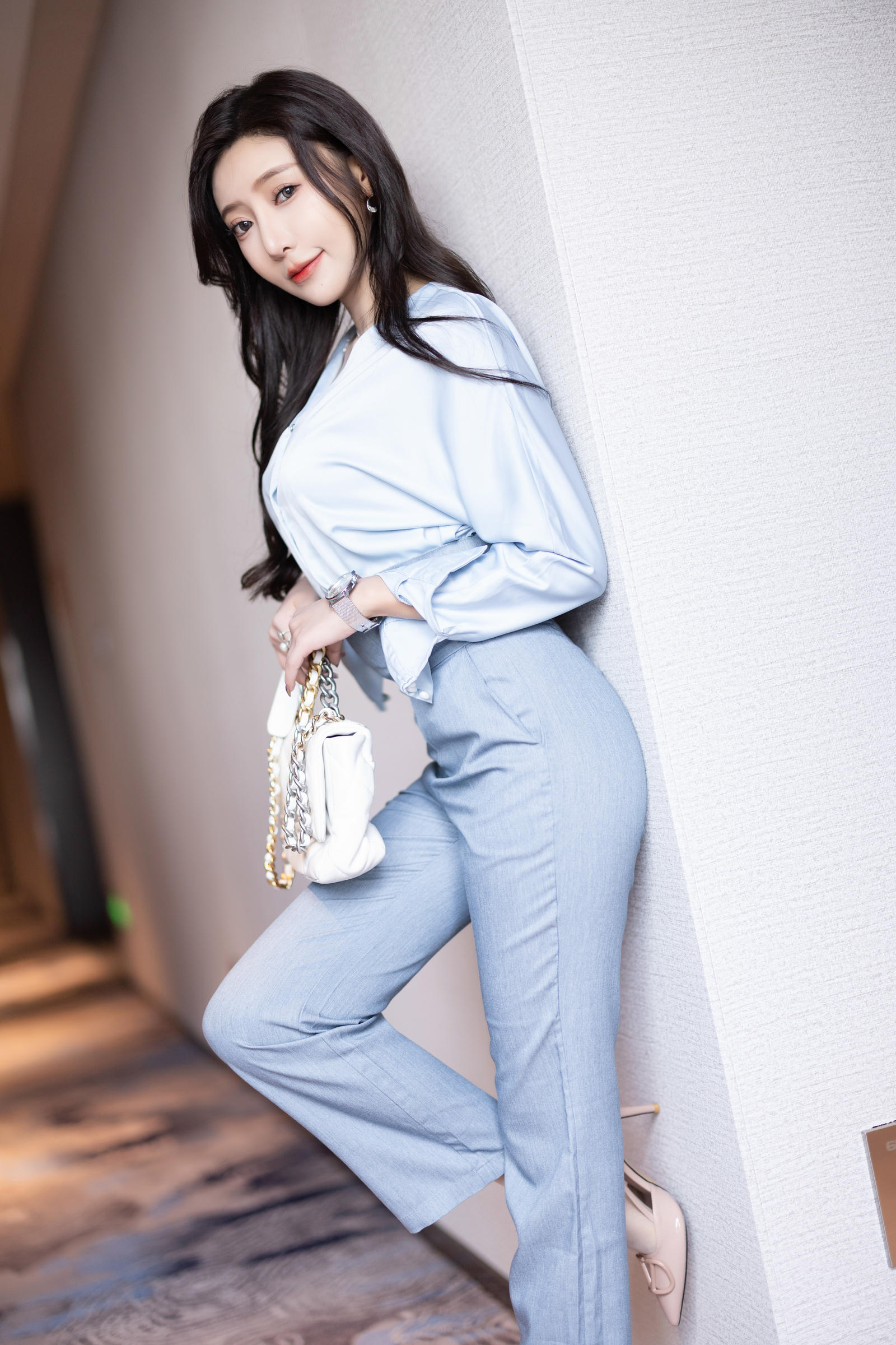 王馨瑶Yanni 内购原版 NO.048 灰蓝色西裤配丝绸上衣